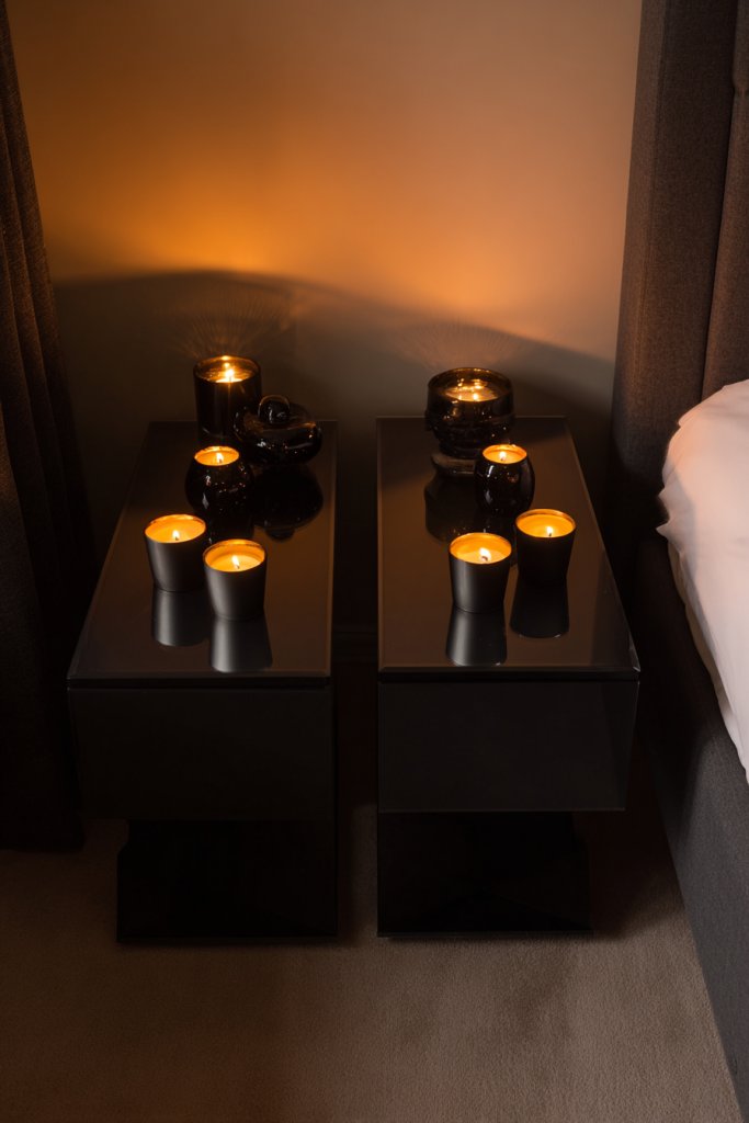 Imagine a pair of sleek, dark-tone nightstands with a cluster of candles—tall taper candles, chunky pillar candles, and tiny votives—arranged artfully on their surfaces. The flickering flames cast dancing shadows, creating a calming, intimate ambiance. The warm glow highlights the surrounding textures of your bedding and decor. This simple setup makes the bedside area feel inviting and personal, perfect for unwinding.