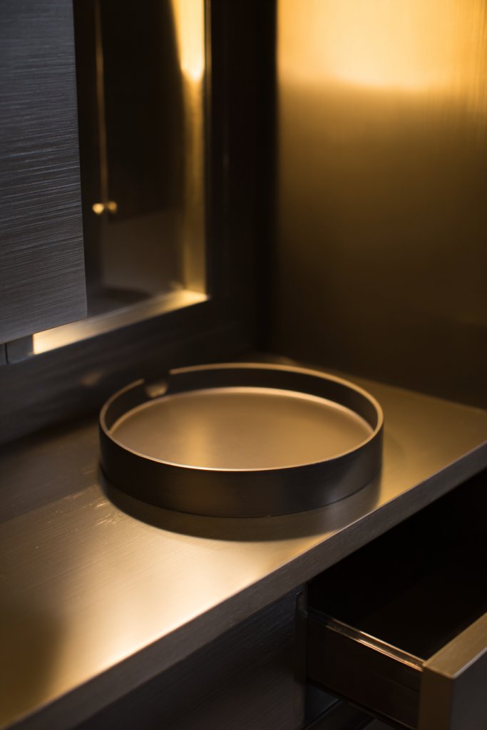 Envision a clean, modern dresser with matte black hardware and a brushed brass tray holding your jewelry or accessories. Small metallic accents catch the light just enough to add interest without overwhelming. The contrast between matte and shiny finishes creates a layered, textured aesthetic. These subtle touches make your entire space feel curated and refined. The overall look is sleek, modern, and effortlessly chic.