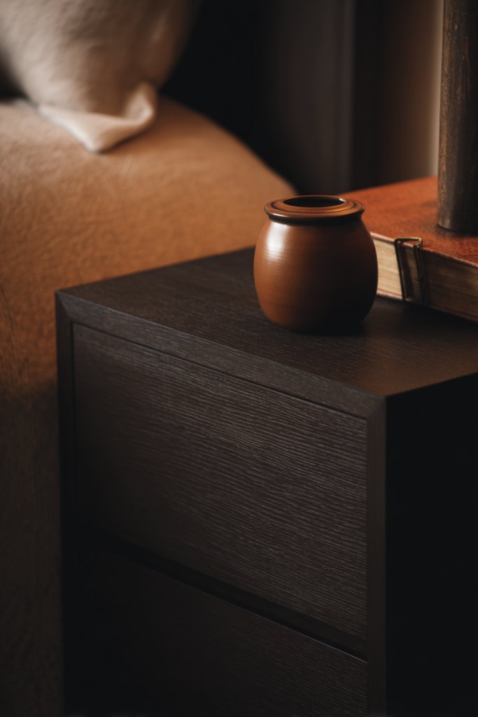 Picture a sleek, matte black or deep wood nightstand topped with warm-toned ceramics, vintage books, or textured vases. Add a small tray or dish in brass or copper to hold jewelry or keys. The combination of dark furniture with warm accents creates a striking contrast that’s both modern and inviting. Ambient lighting or small candles nearby adds a soft glow, enhancing the warm vibe. The overall look is sophisticated yet cozy, perfect for unwinding.