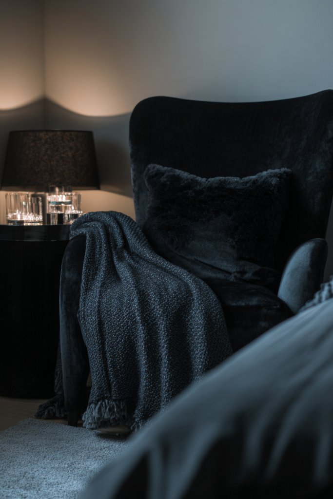 Visualize a corner with a deep, dark velvet or leather lounge chair, layered with textured throws and pillows. A small side table in a dark finish holds a candle or a cup of tea. The area is bathed in warm, layered lighting—think a floor lamp or sconces—and accented with plush rugs or textured curtains. This space feels inviting, intimate, and perfect for unwinding or enjoying a quiet moment. It’s all about making the corner a personal haven.