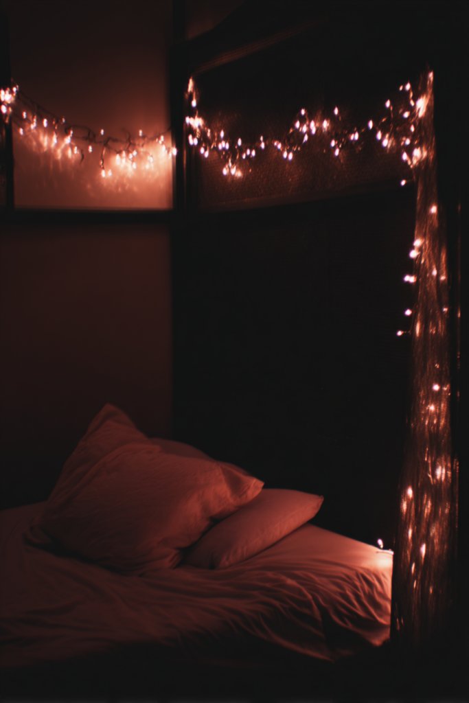 Picture warm string lights draped along your headboard, ceiling, or wall in loose, flowing patterns. The tiny bulbs emit a soft, warm glow that mimics candlelight, creating a gentle ambiance. When dimmed, they produce a calming, fairy-tale effect that’s perfect for relaxing or romantic evenings. The lights add a textured layer to your decor and can be easily turned on or off, giving you full control over the mood. It’s like having a starry night indoors.