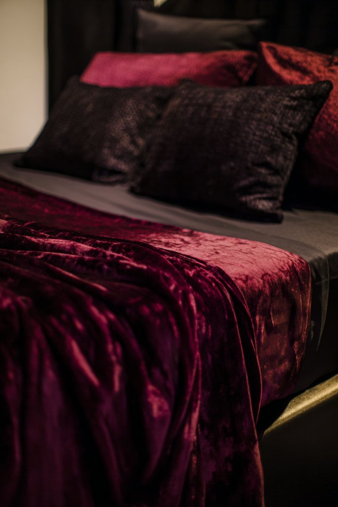 2. Velvet Bedding in Rich Burgundy Tones