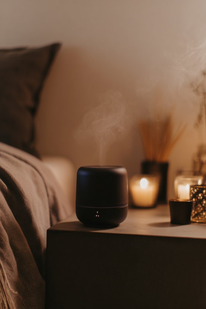 Picture a sleek diffuser on your bedside table, releasing a gentle mist infused with vanilla, sandalwood, or rose. The soft glow of the diffuser adds a calming ambiance, especially when paired with dim lighting. The aroma subtly permeates the room, creating a layered sensory experience. It’s a calming ritual that enhances the mood and makes your bedroom feel like a personal sanctuary. The scent, combined with soft lighting and textures, completes the romantic atmosphere.