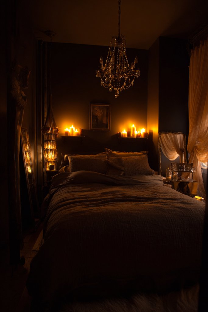 Envision a bedroom with multiple light sources—bedside sconces, fairy lights, and candles—all controllable via dimmer switches. The sconces cast a warm glow on the walls, while fairy lights add a delicate twinkle. Candles flicker softly, creating gentle shadows that dance across the room. When dimmed, the lighting transforms into a cozy cocoon, perfect for unwinding or intimate moments. The layered effect makes the space feel dynamic and welcoming.
