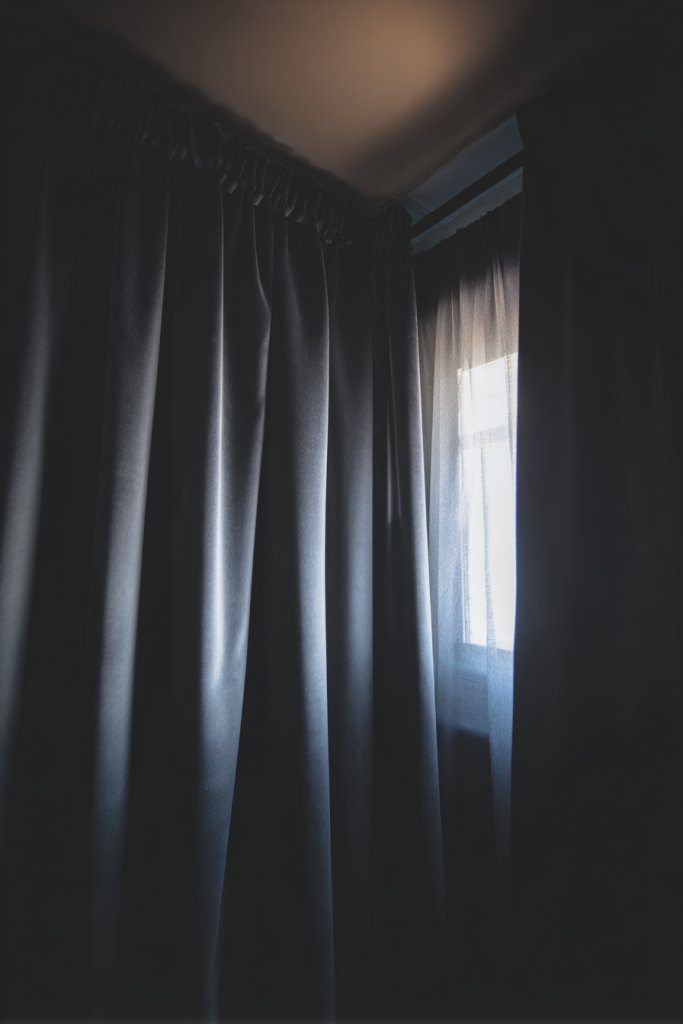 Picture heavy, dark fabric curtains hanging from sleek rods, extending from ceiling to floor. When closed, they transform the room into a shadowy sanctuary, perfect for late mornings or daytime naps. The fabric’s matte finish absorbs light, while the fullness of the drapes adds a sense of luxury. During the evening, they make the room feel snug and secure, inviting relaxation and intimacy. The overall effect is a dark, plush environment that feels like a private retreat.