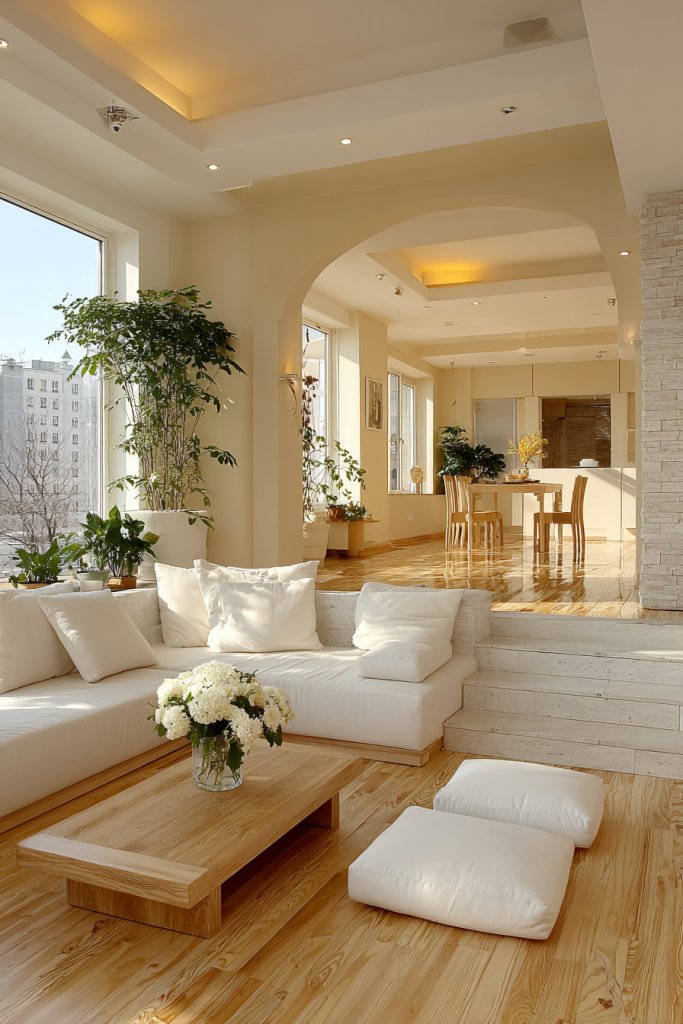 This concept adapts well to modern minimalism with sleek furniture and monochrome palettes, or to a warm rustic look with textured woods and soft textiles. Seasonal touches like lightweight curtains or fabric dividers can add privacy when needed. For smaller spaces, using transparent or open shelving can maintain the flow, while larger homes may incorporate distinct zones with subtle floor rugs or lighting differences.