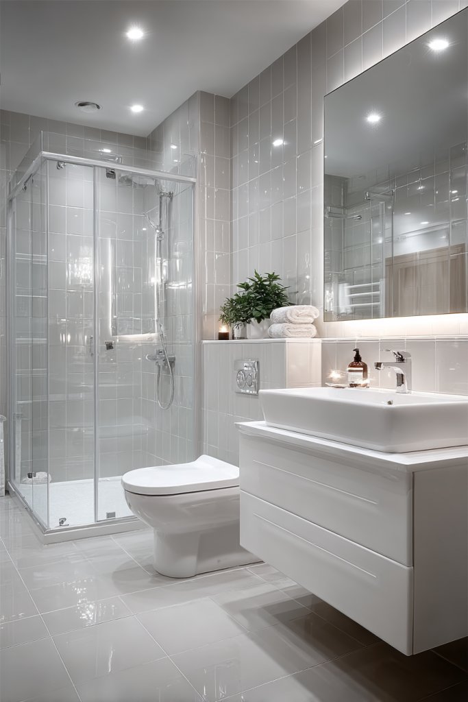 Imagine a corner-mounted sink with a slim profile, paired with a wall-hung toilet that frees up floor space. A glass shower enclosure with built-in niches offers storage without bulk, while a compact vanity provides just enough storage for essentials. Light-colored tiles and sleek fixtures reflect light, creating an airy, open atmosphere. It’s a bathroom designed for both function and style.
