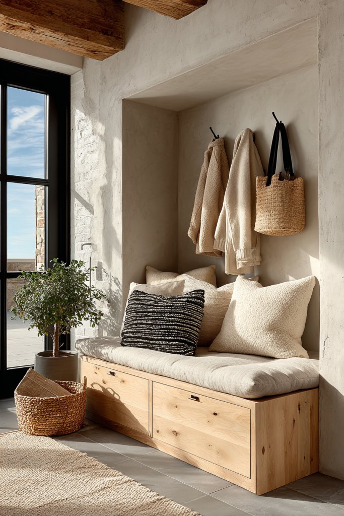 Picture a sleek bench with hidden compartments beneath, topped with a soft cushion and surrounded by wall-mounted hooks for coats and bags. Above, floating shelves hold keys, sunglasses, or decorative items, adding personality. The entire setup feels balanced and inviting, with a neutral color palette and textured finishes that match your decor. It’s a functional piece that welcomes guests and keeps your daily essentials organized.