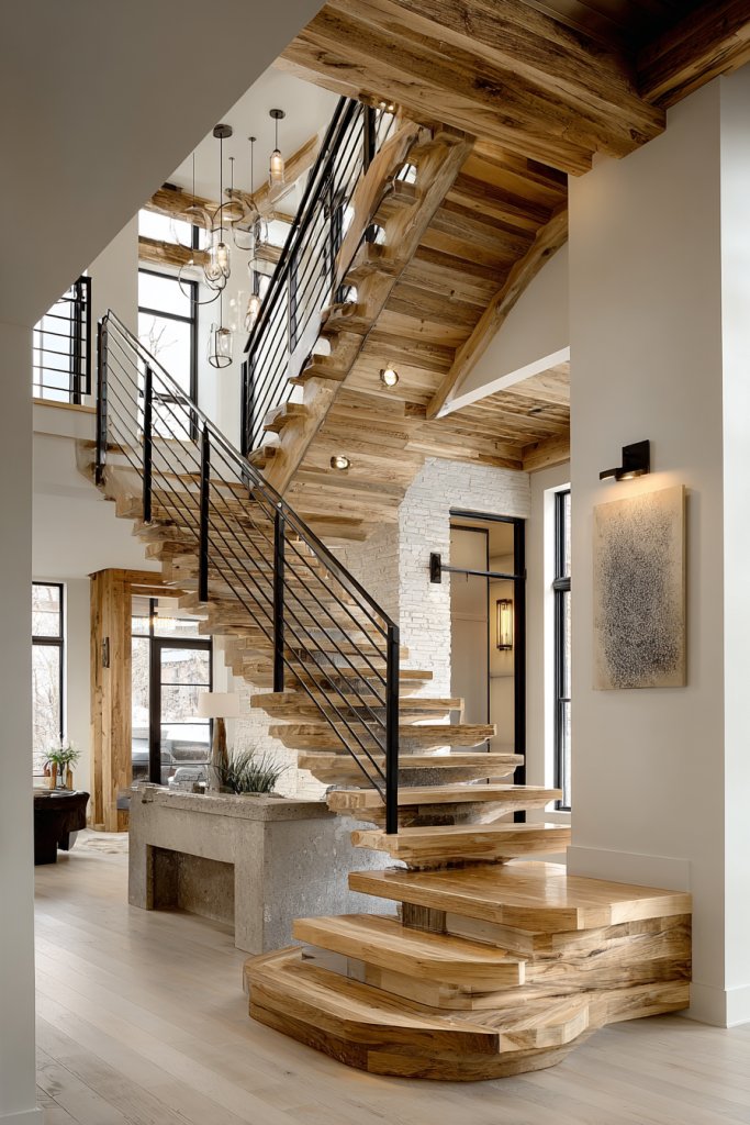 Visualize a sleek staircase with thin metal or glass railings that seem to float in space. The treads are made of light wood or polished concrete, blending seamlessly with the surrounding decor. Open risers allow light to pass through, eliminating visual barriers. The overall effect is a sculptural element that enhances the home’s contemporary aesthetic.
