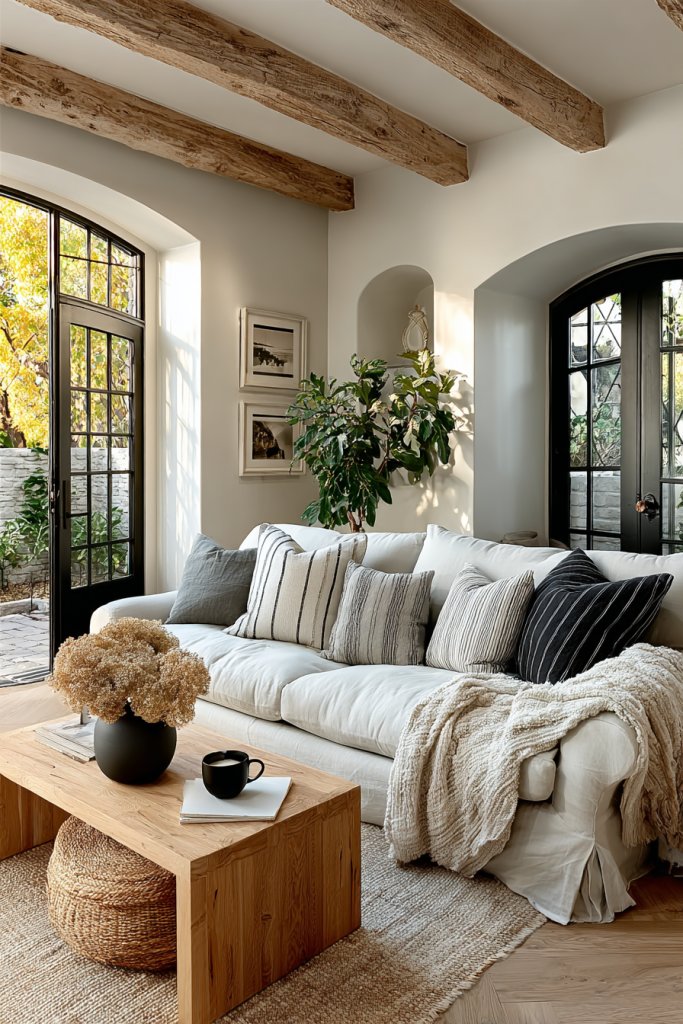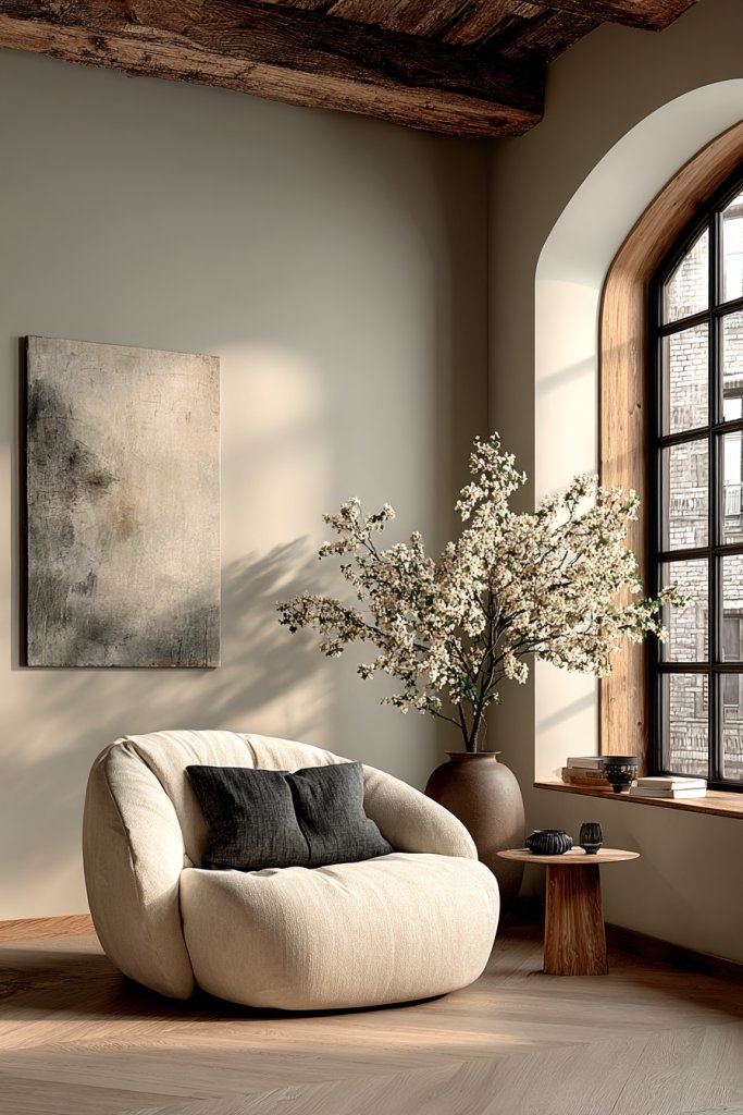 Layer textures like woven baskets, linen curtains, or shaggy rugs to add warmth and dimension. You can introduce gentle color accents through textiles or accessories, like blush cushions or pale blue ceramics, to break monotony. Seasonal updates could include swapping out textiles or adding darker accent pieces for contrast in winter or spring.