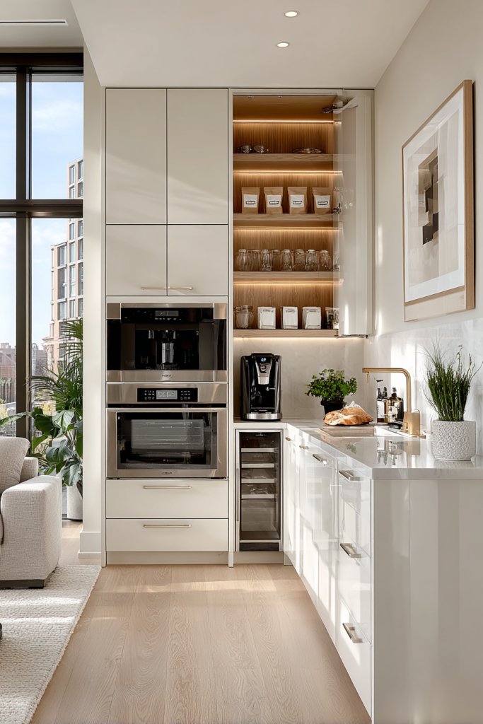 Imagine sleek, tall cabinets reaching all the way to the ceiling, with pull-out pantry shelves filled with neatly arranged spices and ingredients. Hidden compartments keep appliances out of sight when not in use, and a compact island provides extra prep space without crowding. The overall look is clean, with a seamless flow that invites you to cook and entertain effortlessly.