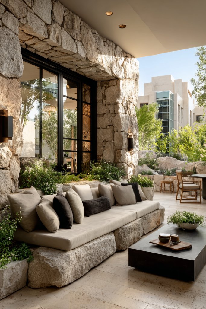 Picture a cozy, covered patio with a textured stone or wooden floor, furnished with weather-resistant seating and a small dining table. Soft outdoor lighting casts a warm glow in the evening, while ceiling fans or heaters add comfort. The space flows seamlessly from your living room through large sliding doors, with lush greenery or decorative screens adding privacy and style. It’s a perfect spot for morning coffee or evening gatherings.