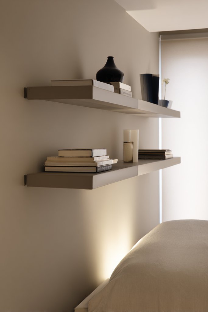 Imagine sleek, minimalist floating shelves mounted high on the wall, holding neatly folded linens, decorative boxes, or even a few curated accessories. The shelves appear to hover effortlessly, creating a sense of extra space. The wall’s neutral color makes the shelves and their contents pop subtly, adding visual interest without overwhelming. You can almost hear the soft thud of books or the gentle glow of a nearby lamp reflected in the room’s calm ambiance.