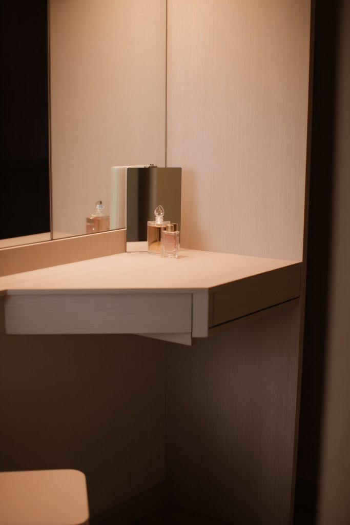 Imagine a sleek, wall-mounted vanity with a mirrored surface and a few well-chosen accessories. The table’s clean design leaves plenty of room for your cosmetics, brushes, and jewelry. Soft lighting from nearby sconces or LED strips enhances the setup, while a cushioned stool invites you to sit comfortably. The vanity’s presence transforms a corner into a mini beauty salon, radiating style and function.