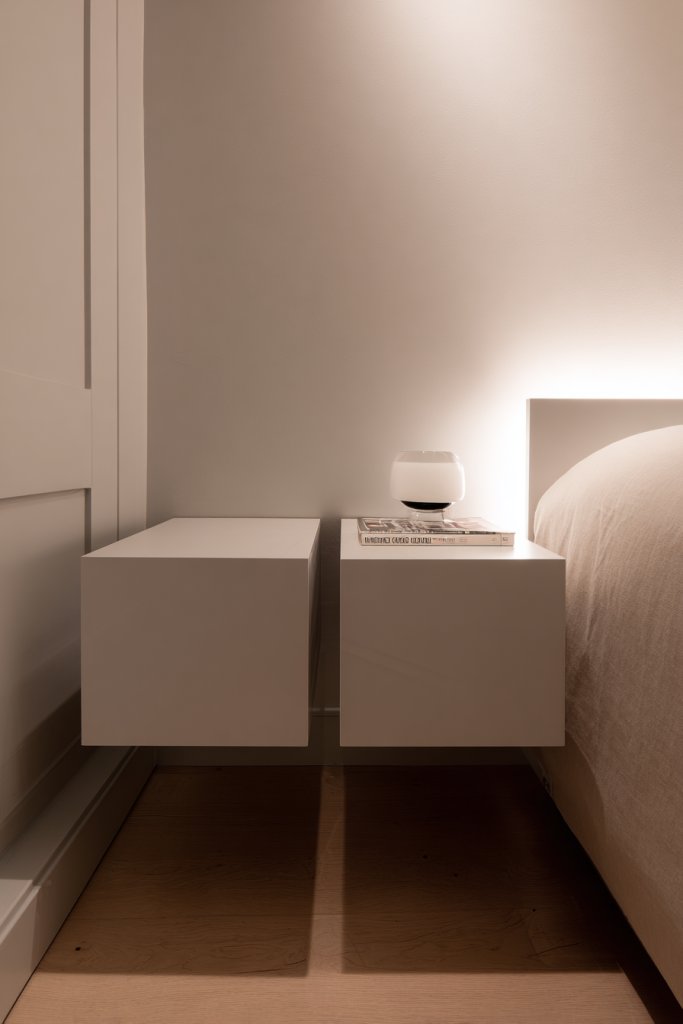 Visualize a small, wall-mounted table with a smooth surface, holding a few essential items like a book or a small clock. The floating design creates a visual illusion of more space around the bed, reducing clutter. Soft lighting from nearby sconces or LED strips enhances the sleek look, casting gentle glows. The absence of bulky furniture makes the room look more open and inviting.
