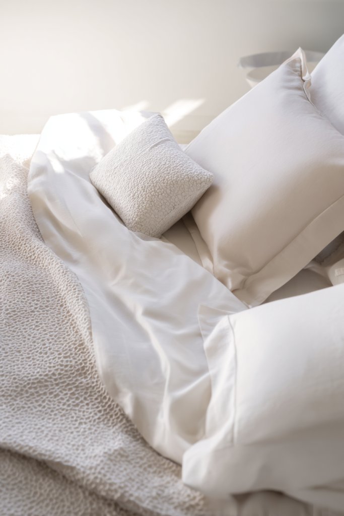 Picture a bed dressed in a silky, cream-colored duvet with a chunky knit throw blanket draped casually. Layered pillows in shades of taupe and beige add softness and dimension, inviting relaxation. The subtle textures catch the light, creating gentle shadows that add visual depth. The overall look is calm, cozy, and effortlessly luxurious, making the tiny room feel more expansive.