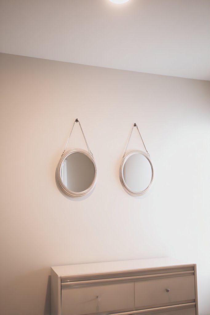 Picture a round, beveled mirror hung above a small dresser or next to the bed. Its unique shape catches the eye and adds a touch of elegance. The mirror reflects soft ambient light, brightening the corner and giving the illusion of depth. Its decorative frame complements your style, whether minimalist, boho, or glam, enhancing the overall aesthetic.
