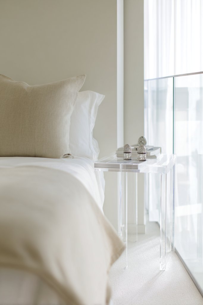 Imagine a transparent acrylic side table next to your bed, catching the soft glow of nearby lighting. Its sleek surface reflects surrounding colors and textures, blending seamlessly into the decor. The light, almost invisible furniture keeps sightlines open, making the room seem larger. It’s a subtle but impactful trick to enhance spaciousness.