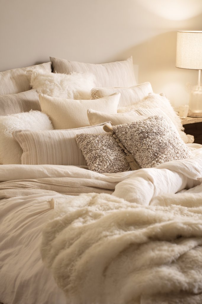 Picture a bed dressed in a neutral-toned, textured throw in a soft fabric like velvet or chunky knit. Multiple cushions in varying sizes, fabrics, and colors add visual interest and comfort. The layered textiles catch the light and create a plush, inviting look. The overall effect is a warm, layered aesthetic that beckons you to relax.