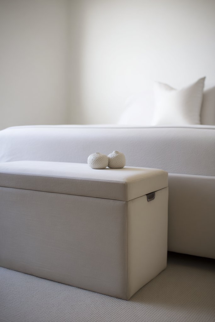 Picture a soft, upholstered ottoman in a neutral hue placed at the foot of your bed. Its plush surface invites you to sit or put your feet up, while the hidden compartment stores extra blankets or shoes. The fabric’s texture adds softness, balancing the room’s sleek lines. The ottoman’s understated elegance makes it a versatile decor piece.