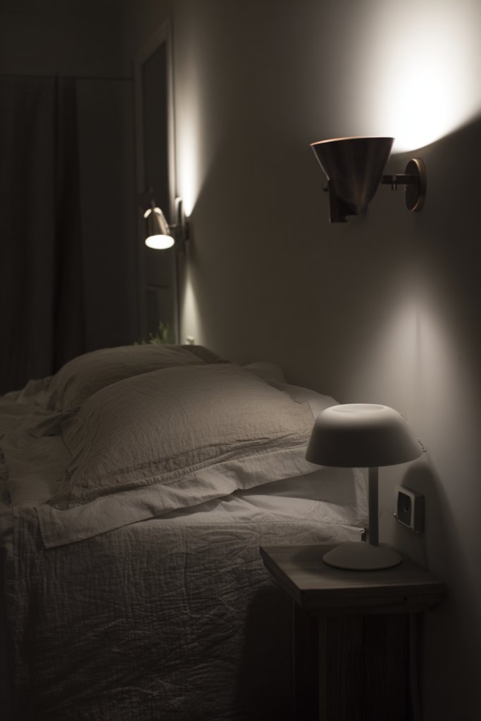 Visualize soft, warm light emanating from a chic table lamp on a bedside table, complemented by sleek wall sconces on either side. The layered effect eliminates shadows, highlighting textures like plush bedding or a textured wall finish. The gentle flicker of warm-toned bulbs creates an inviting ambiance, making the room feel more open despite limited space. The warm glow reflects subtly off nearby surfaces, adding depth and dimension.