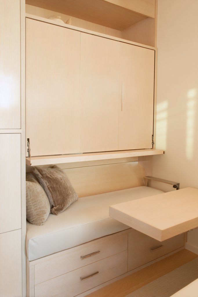 Picture a sleek bed with built-in drawers underneath, perfect for storing clothes or bedding. Nearby, a fold-down desk doubles as a workspace and a vanity, folding away when not in use. The furniture’s clean lines and neutral tones blend seamlessly into the room, giving it an uncluttered, modern vibe. Soft textiles and subtle lighting complete the cozy yet efficient look.