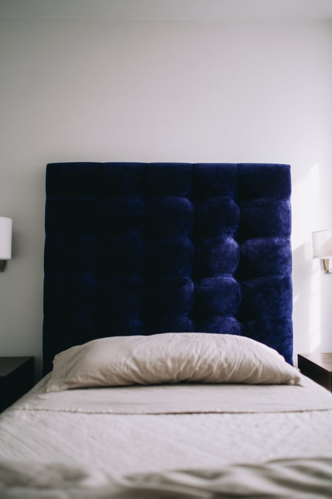 Envision a plush, tufted headboard in a vibrant jewel tone that contrasts beautifully with neutral walls. The rich texture and deep color create a luxurious vibe, transforming the bed into a statement piece. Soft ambient lighting highlights its details, casting gentle shadows that add depth. The overall effect is a cozy, inviting retreat that feels both stylish and personal.