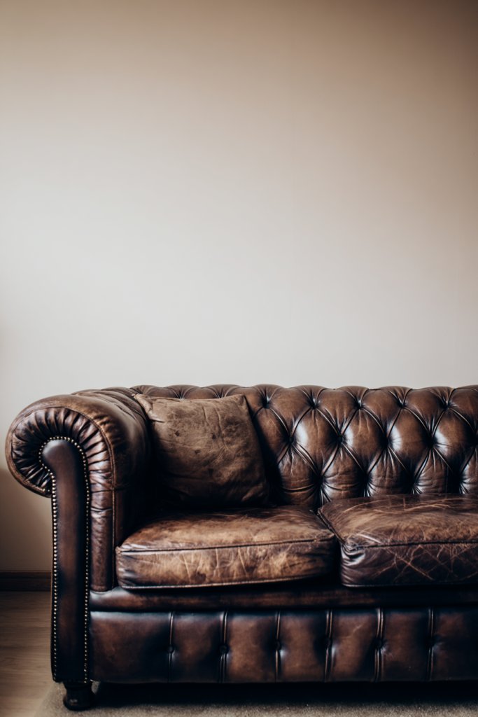 Imagine rich, caramel or deep brown leather with a slightly aged patina. The plush cushions and deep button-tufting create a sense of opulence. It’s placed against a textured wall, paired with vintage rugs or layered textiles. The sofa invites you to sink in and relax, making every seat feel special.