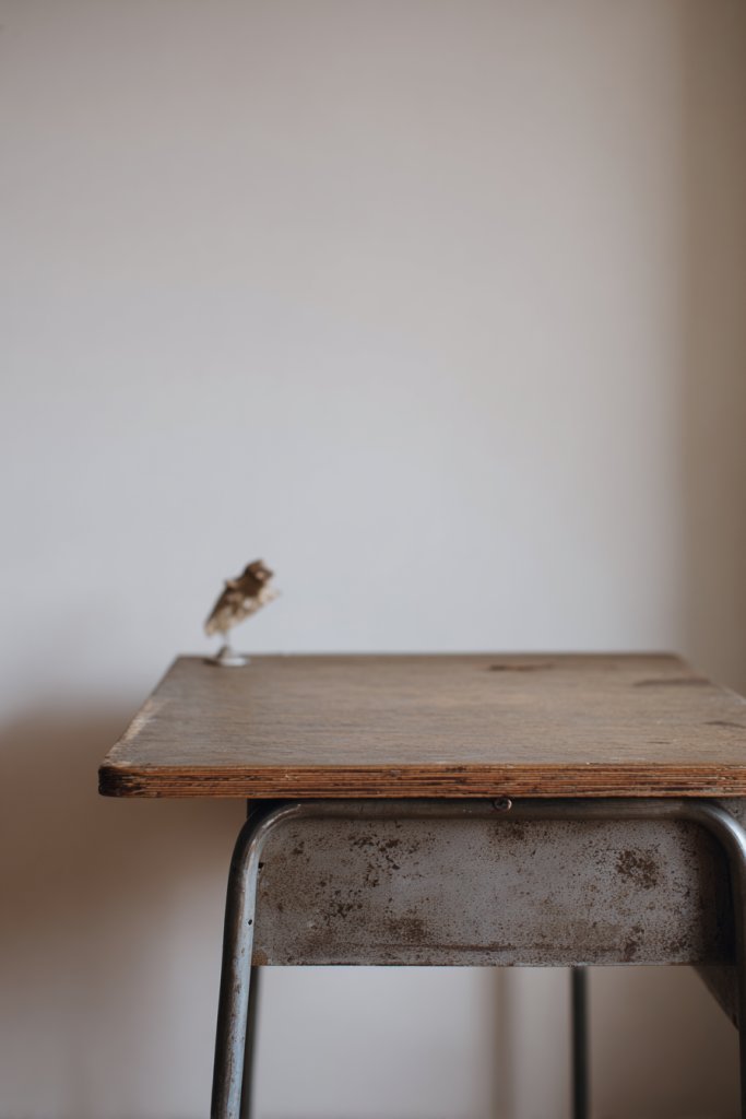 Imagine a sturdy wooden desk with a worn, faded paint finish, revealing layers of history. The surface is smooth yet retains the marks of past use—scratches, paint chips, and a patina of age. It’s paired with a vintage metal chair or a simple modern stool for contrast. Natural light highlights its textured surface.