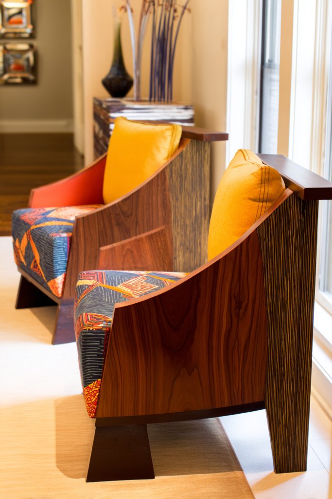 Picture a chair with a smooth walnut wood frame, curved armrests, and tapered legs. The upholstery features retro patterns or solid bold colors like mustard or teal, adding a pop of personality. The fabric’s texture contrasts beautifully with the polished wood, creating visual interest. It’s a perfect spot to curl up with a book or chat with friends.