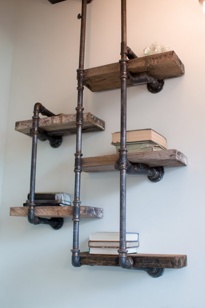 Visualize sturdy black iron pipes with vintage fittings supporting thick wooden shelves. The rough, weathered finish hints at a storied past. Display antique cameras, books, or decorative objects on the shelves, which add a layered, industrial feel. Exposed fittings and pipes make a bold design statement.