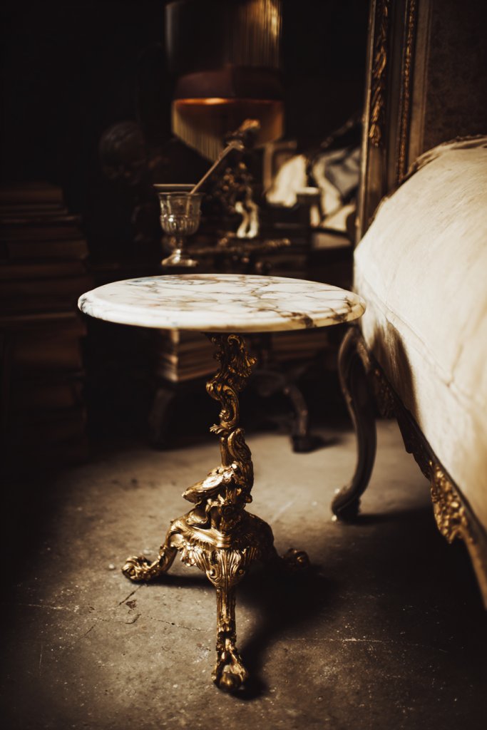 Imagine a small table with a round marble top in soft white or gray, supported by a carved wooden base with intricate details. The base might feature floral motifs or scrollwork, finished with aged gilding or patina. Positioned beside a sofa or armchair, it adds a regal vibe and a sense of history.