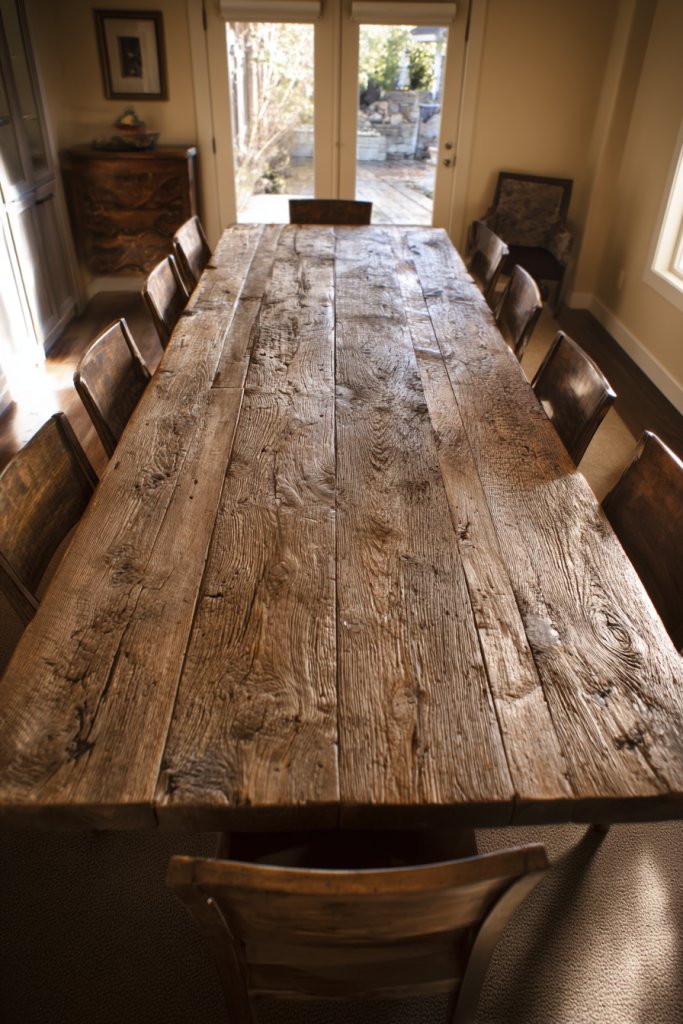 Envision a large, solid wood table with a distressed white or natural finish. The surface bears gentle scratches and dents, telling stories of countless shared meals. Around it, mismatched reclaimed wood chairs add character—some with paint remnants, others with rustic metal accents. Warm lighting overhead emphasizes the table’s natural grain, creating an inviting glow.