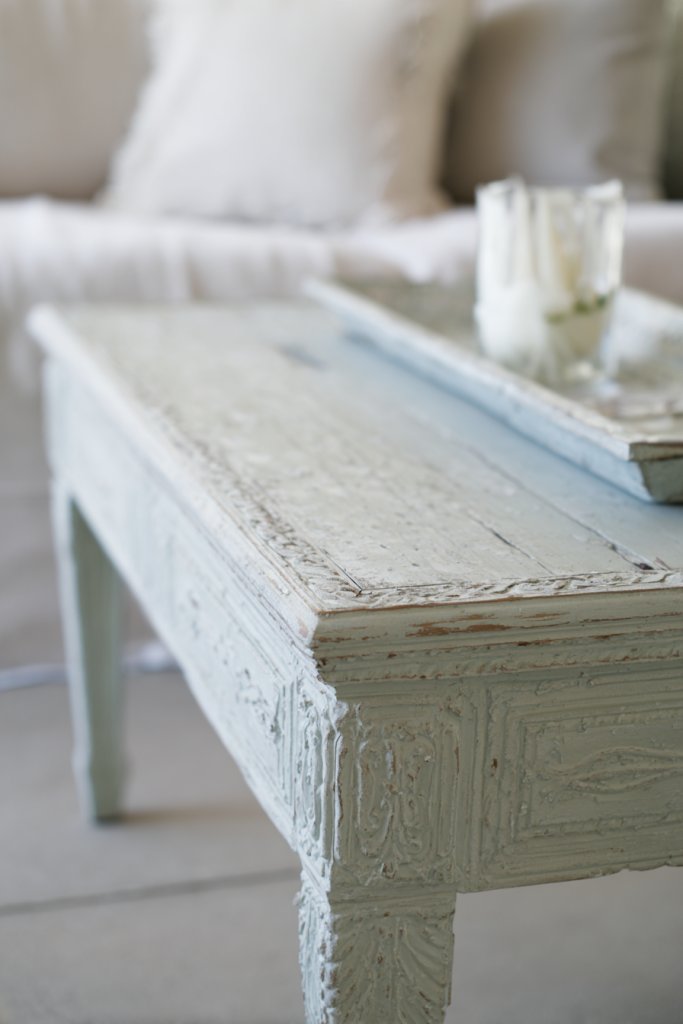 6. Vintage-inspired Coffee Table with Distressed Paint and Carved Details