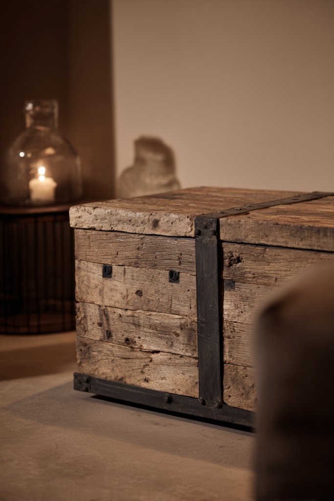 Visualize a repurposed wooden crate with distressed paint or natural finish, complete with metal handles on the sides. Its open design invites you to store blankets, books, or toys, while its vintage appeal adds character. Place it beside a wicker chair or a vintage sofa, where it looks like a piece straight out of a farmstead or market. The weathered textures and simple design evoke warmth and practicality.