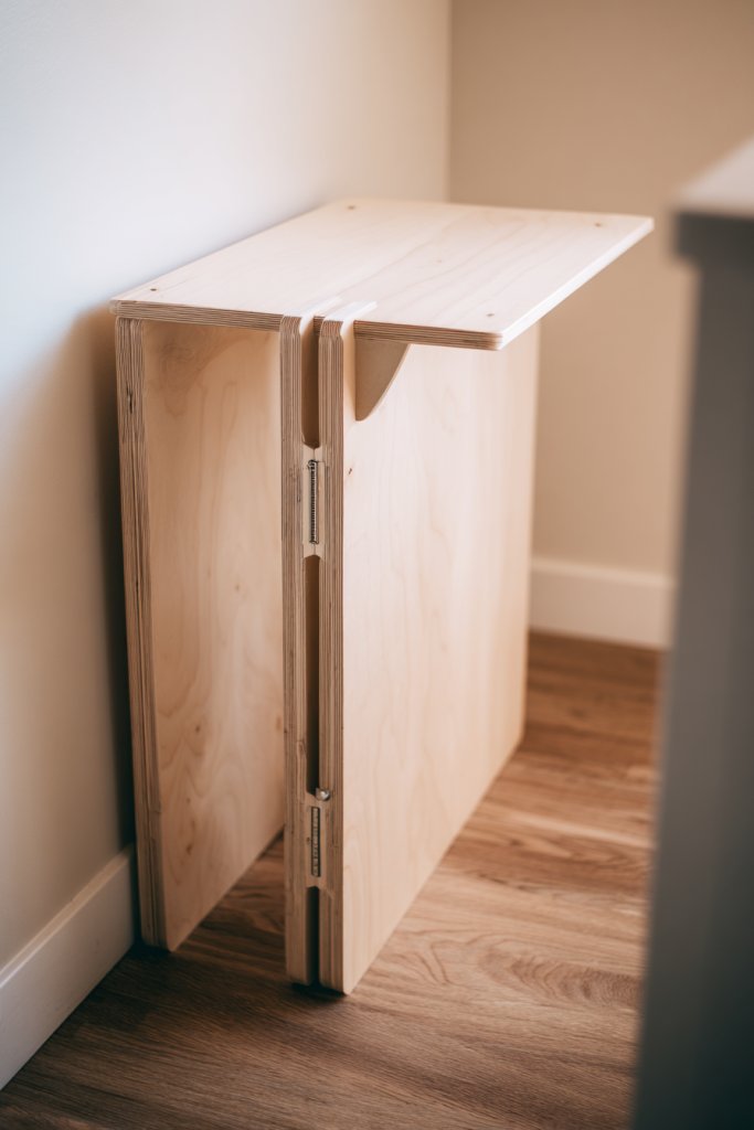 Select a lightweight yet durable wood, then cut the tabletop and foldable legs with basic tools. Attach hinges or metal brackets to allow folding, ensuring they lock securely when open. Sand all edges for safety, and finish with a protective sealant or paint. Test the fold and unfold mechanism for stability and ease of use. Store flat against a wall or under a bed when not in use to maximize space.