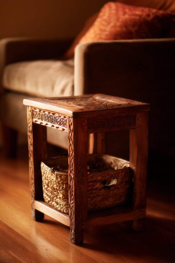 Imagine a wooden table with intricate carved patterns on the surface or sides, combined with a woven or wooden open basket as the base. The carvings add visual texture, inviting touch and admiration. The open basket keeps everyday items accessible—magazines, throws, or small accessories. Its artisanal feel complements boho, rustic, or eclectic decor, making it both practical and charming. The natural wood grain and carvings create a layered, tactile experience.