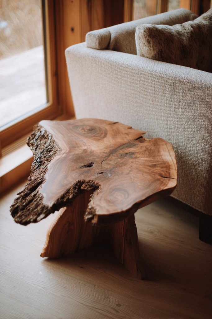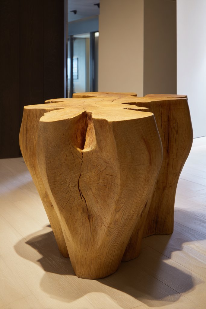 Choose woods with striking grain patterns or unusual shapes—live edge, twisted branches, or reclaimed wood with natural splits. Finish with oils or stains that highlight the natural irregularities. It suits eclectic, bohemian, or contemporary interiors, adding contrast to more structured furniture. Seasonal styling can include layered textiles or decorative objects that echo the irregular shapes. It’s all about embracing the unexpected.