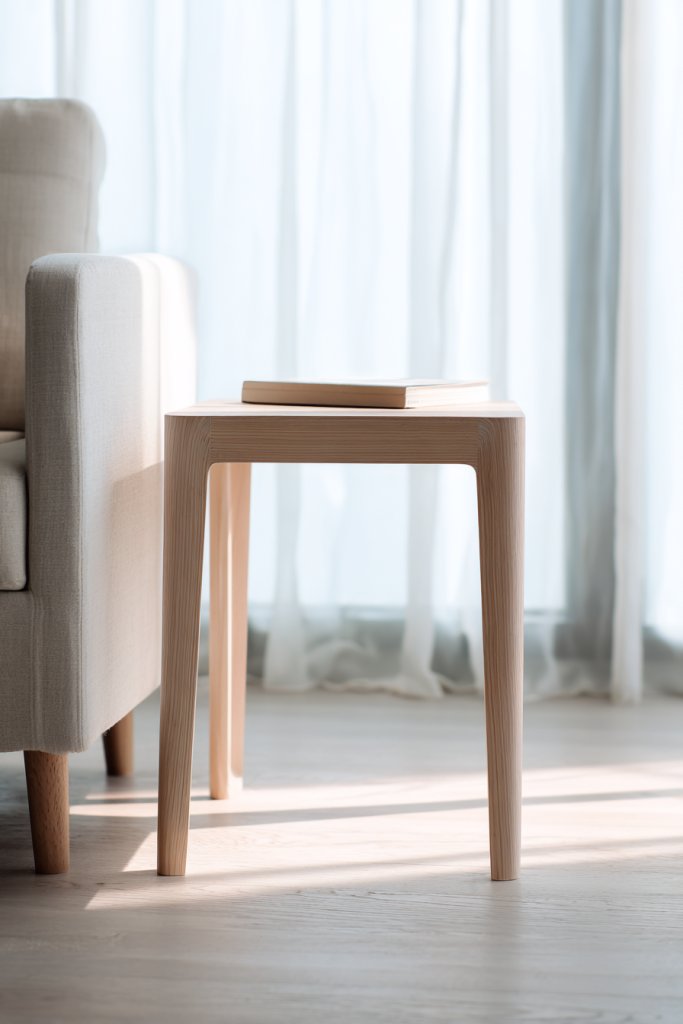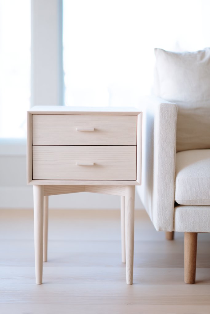 Imagine a sleek, pale wood surface with smooth edges and tapered legs that subtly elevate the piece. The light hue, like birch or ash, reflects natural light and makes your room feel airy and open. It sits quietly beside a cozy armchair or bed, its understated design allowing other decor elements to shine. The texture is soft to the touch, and the minimalist silhouette blends effortlessly into the background, creating a calm, uncluttered aesthetic.