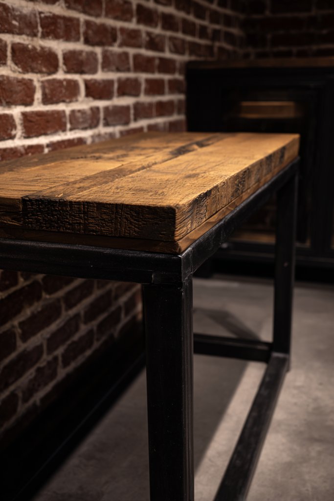Picture a thick wooden top with a weathered finish, supported by a sturdy black steel frame with visible welds and bolts. The contrast between warm, textured wood and sleek metal creates a striking visual balance. Place it beside a leather sofa or metal chair, where it adds rugged charm and industrial edge. The raw materials and construction details invite admiration and evoke a sense of craftsmanship.