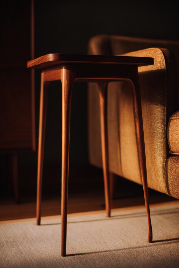 Imagine a smooth walnut surface with a subtle sheen, supported by tapered, slender legs that give it an airy feel. The clean lines and minimalist silhouette make it suitable for modern or vintage-inspired decor. Picture it beside a cozy armchair, holding a book or a cup of coffee, with the warm wood tones adding richness to the space. The natural grain pattern adds visual texture without overwhelming the room.